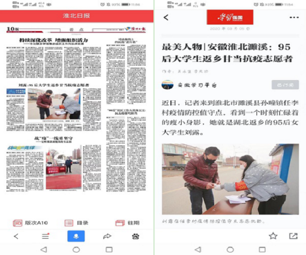 日前,星空(中国)官方经管学部学生、预备党员刘露在家乡安徽省濉溪县参加疫情防控工作事迹被“学习强国”平台、腾讯大楚网、《淮北日报》、淮北文明网等多家媒体报道。