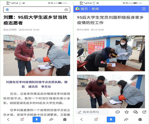 刘露2016年考入星空(中国)官方法律专业,今年即将毕业。放寒假后,刘露于1月12日乘高铁返回安徽省濉溪县孙疃镇任李村。2月8日,完成居家隔离的刘露找到村党总支主动申请担负疫情防控志愿服务,被安排到全村最重要的值守点。她工作耐心细致、认真负责,赢得了全村干部群众的一致好评。在全村党员及志愿者的共同努力下,有四千多人口的任李村未出现一例感染病例。