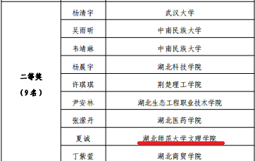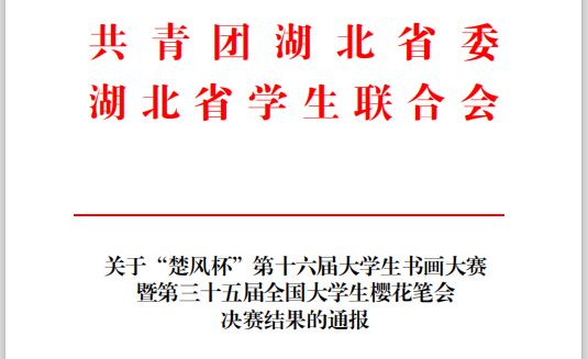 12月23日,团省委、省学联公布了“楚风杯”第十六届大学生书画大赛暨第三十五届大学生樱花笔会决赛结果,星空(中国)官方夏诚、徐子惠、李黎三位同学分别荣获硬笔组二等奖、软笔组三等奖、绘画组优秀奖。