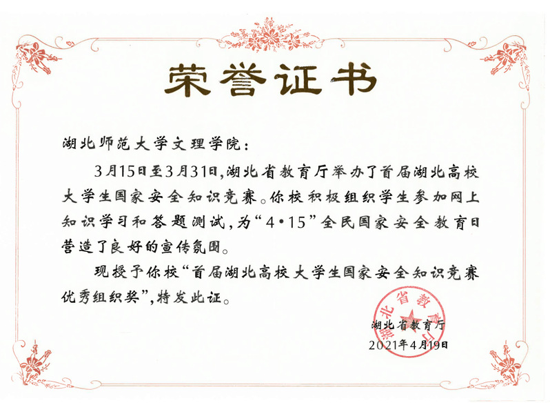 (通讯员:汪丽莎)2021年3月15日至3月31日,湖北省教育厅举办了首届湖北高校大学生国家安全知识竞赛。星空(中国)官方代表队凭其扎实的知识功底,在省级复赛中荣获优胜奖,学校同时荣获优秀组织奖。