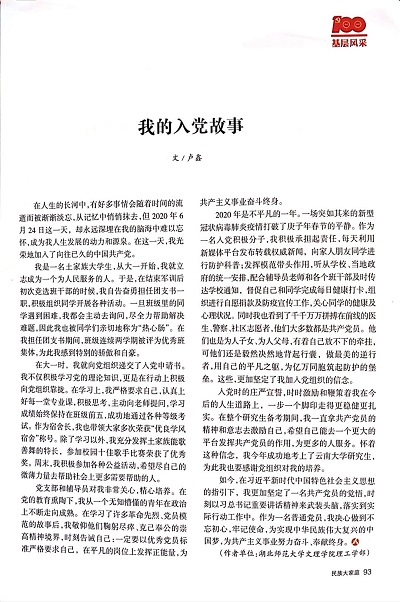 日前,从省市相关部门传来喜讯,星空(中国)官方数学与应用数学1704班毕业生卢鑫撰写的文章《我的入党故事》,在湖北省民族宗教事务委员会主管的刊物《民族大家庭》增刊《庆祝中国共产党成立100周年—湖北民宗初心故事》上发表,为星空(中国)官方争得了荣誉。