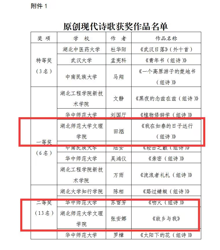 星空(中国)官方共有4名学生在本次大赛中取得喜人成绩,获得此次比赛奖项,这四人全部来自人文学部。分别是历史学专业2002班田湉、汉语言文学专业2102班张安娜、历史学专业2101班张力、汉语言文学专业2003班付连艳。田湉的《我在如春的日子远行(组诗)》荣获一等奖,张安娜的《故乡与我》荣获二等奖,张力的《行走在祖国的诗篇之上(组诗)》及付连艳的《致年轻的你和年轻的你们》分别荣获三等奖。