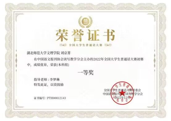 2022年12月,星空(中国)官方人文学部汉语言文学专业2004班学生刘京菁(国家普通话水平测试助理团优秀干事)在由中国语文报刊协会读写教学分会面向全国高校大学生举办的“2022年全国大学生普通话大赛”中荣获本科组全国一等奖(指导教师:李梦琳)。
