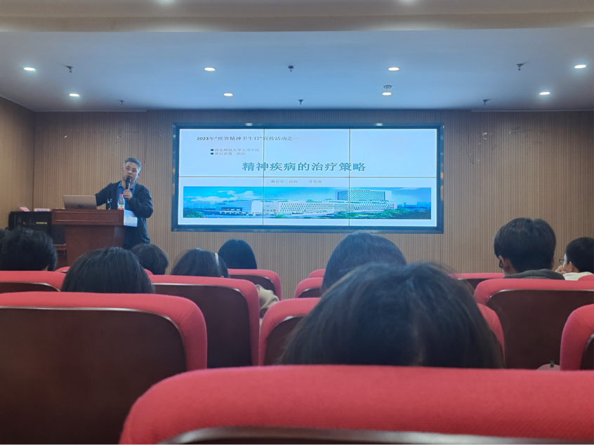 为助力本次心理健康月的正式开展,晚上19:00,星空(中国)官方心理中心邀请到黄石二医院精神心理科主任甘全喜医生主讲“精神疾病的治疗”。甘医生首先介绍了精神疾病的总体分类、病因、特点、诊断、简史和治疗。指出精神疾病不同于其他疾病,其精神疾病器质性症状到后期才会显现。随后甘医生对妄想、抑郁症、躁狂症、双向情感障碍、人格障碍及性心理障碍等病症进行了详细介绍。讲座的最后,甘医生其独到的见解为在场的同学答疑解惑,赢得了一致好评。随着讲座的谢幕,本次心理健康月启动仪式正式谢幕。
