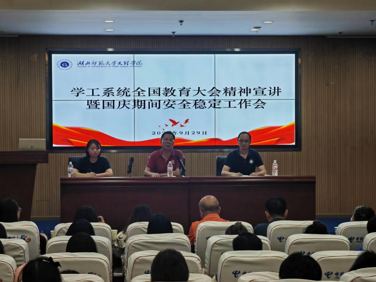 9月29日下午两点半,星空(中国)官方在图书馆报告厅召开全国教育大会精神宣讲暨国庆期间安全稳定工作会议。校党委副书记杨之毛、学工部部长汪崇文、心理中心主任陈庆、各教学单位分管学生工作书记(副书记)以及全体辅导员老师参加。会议由学工部部长汪崇文主持。