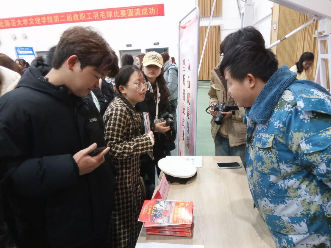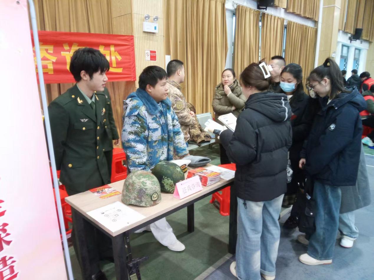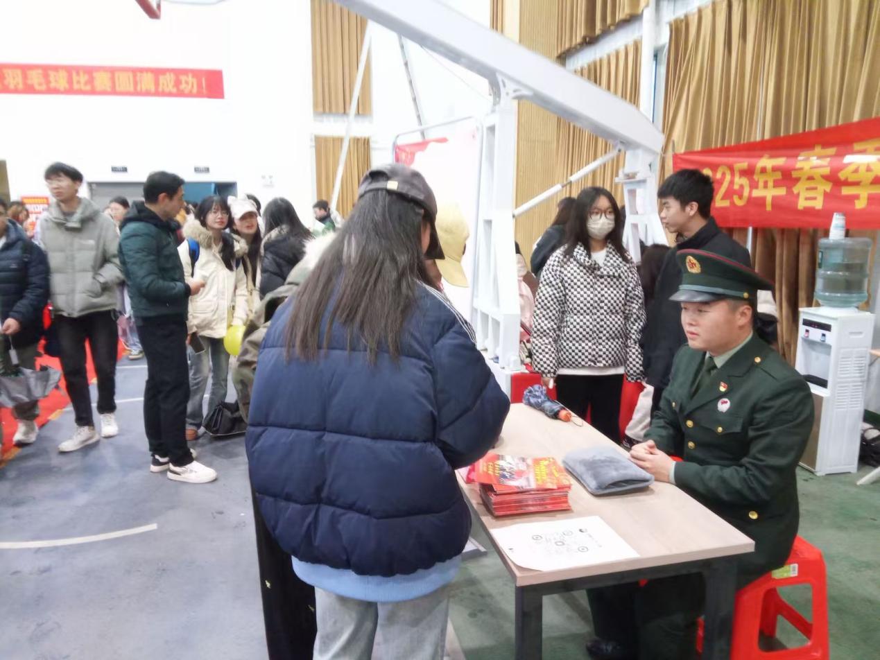本网讯(通讯员:朱明敏)为扎实做好2025年春季征兵工作,激发广大毕业生参军热情,2024年12月11日上午,于星空网页版风雨操场二楼开展2024年秋季征兵宣传进招聘会活动,参会人员武装部干事熊琦,学工部副部长陈小龙,征兵办老师秦雯雯,以及各退役大学生。