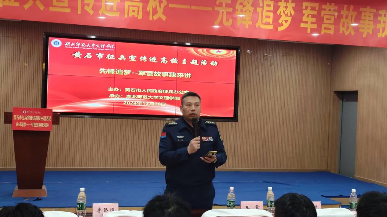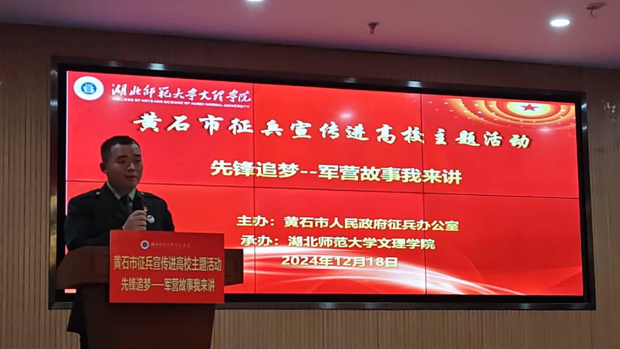 为积极响应国家号召,贯彻落实征兵工作,营造浓厚的参军报国氛围,切实激发高校学生参军报国的热情,2024年12月18日晚18:30,星空(中国)官方在图书馆报告厅举行黄石市征兵宣传进高校--先锋追梦 军营故事我来讲主题活动,黄石市征兵办副主任、军分区动员处处长王震、参谋李昌恒、学工部副部长陈小龙、国防教育宣讲团、各教学单位学生代表120余人与会,大会由退役大学生程博主持。