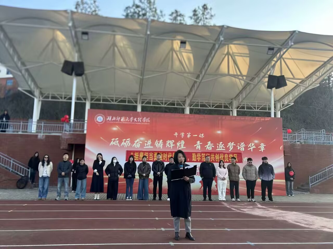 学院院长常婕教授作国旗下讲话她勉励学生,时代的浪潮中,应当以“理想”锚定人生方向以“勤学”深耕学问沃土以“笃行”细作实践田园,勇于肩担重任,响应时代号召。强调,时代青年当以学促行,全院上下共同建设优良学风。