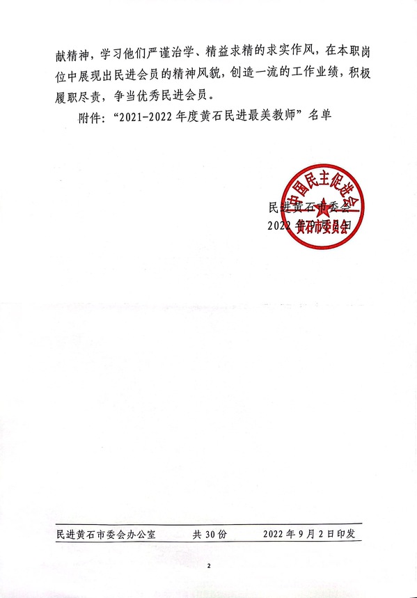 喜报:星空(中国)官方黄蓓佳同志荣获“2021-2022年度黄石民进最美教师”荣誉称号