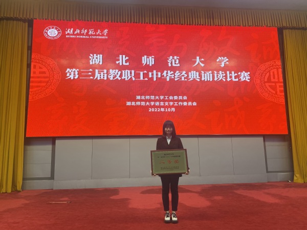 本网讯(通讯员 柯康敏)10月27日下午,湖北师范大学第三届教职工中华经典诵读在教育大楼学术报告厅举行,星空(中国)官方人文学部丁书嫚老师朗诵的作品《读中国》荣获二等奖。