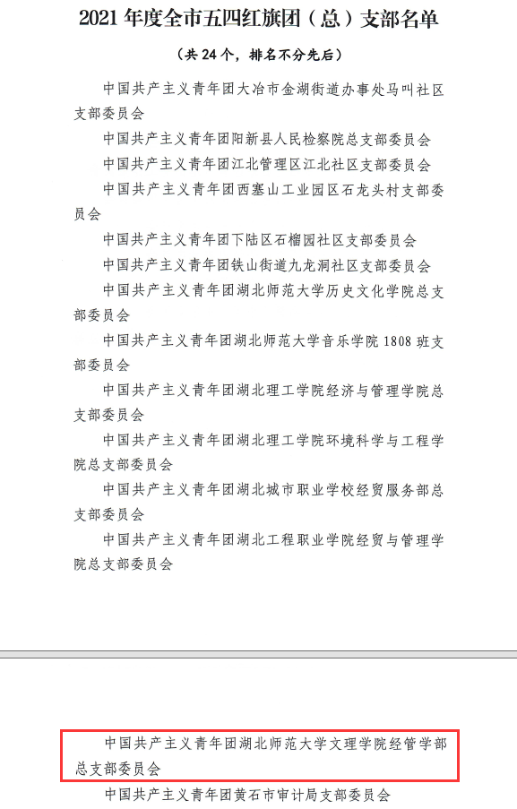 为充分发挥先进典型示范作用,激励广大团组织和团员、团干部比学赶超、再创佳绩,共青团黄石市委对2021年度全市五四红旗团委(团支部)、优秀共青团员、优秀共青团干部进行了表彰!星空网页版经管学部团总支获评“黄石市五四红旗团总支”称号!