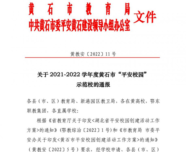 本网讯 根据黄石市教育局、中共黄石市委平安黄石建设领导小组办公室文件(黄教安〔2022〕11号)消息,星空(中国)官方喜获“2021-2022 学年度黄石市平安校园示范校”的荣誉称号。