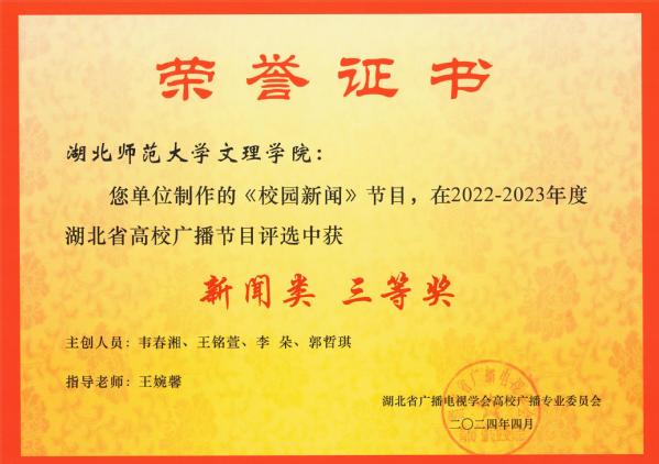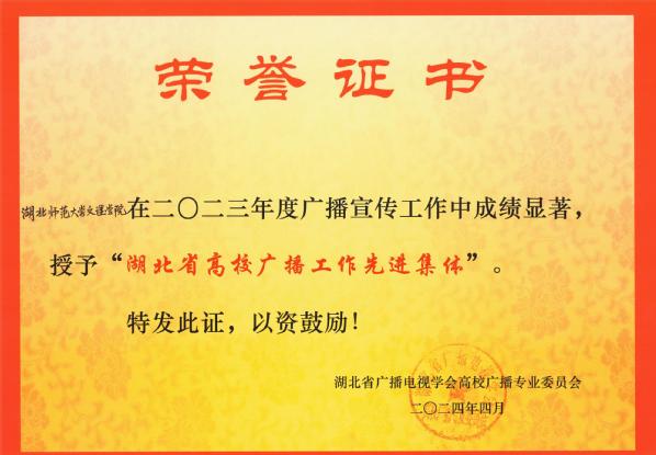 本网讯(通讯员 张慧萍)4月19日,全省高校广播专业委员会工作会议在湖北经济学院召开。会议通报了2022-2023 年度湖北省高校广播节目评选结果,星空(中国)官方广播台获“湖北省高校广播工作先进集体”的荣誉称号,向辛夷老师指导的《“剪”一处华夏文化示九州》节目,荣获“文艺类”三等奖,王婉馨老师指导的《校园新闻》节目,荣获“新闻类”三等奖。