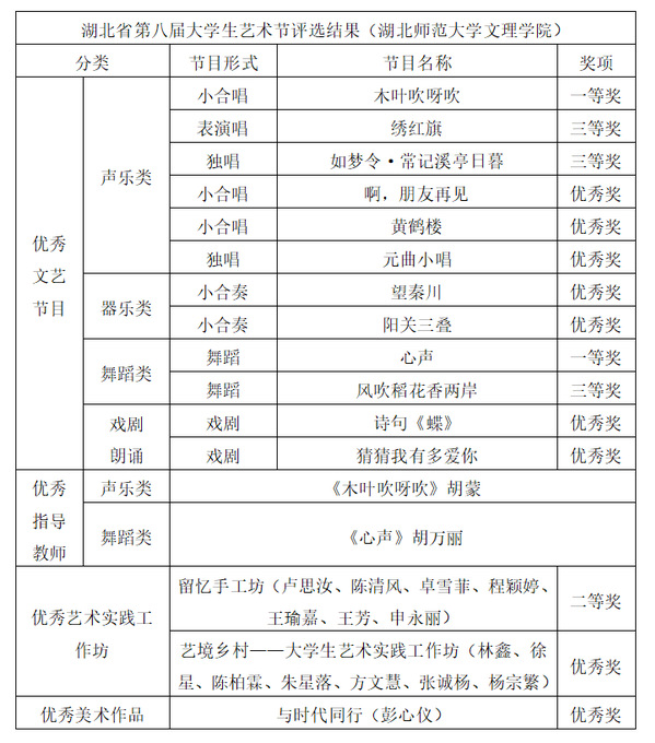 本网讯 5月6日,湖北省教育厅公布关于湖北省第八届大学生艺术节优秀组织奖和“三优一案例”评选结果的通知。星空(中国)官方教育与艺术学部荣获17个奖项,其中一等奖2项,二等奖1项,三等奖3项,优秀奖9项。胡蒙、胡万丽获指导教师奖。