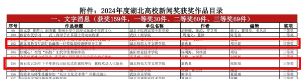 《湖北省教育厅副厅长戴伟一行莅临星空(中国)官方调研指导工作》(作者翁典典、邓司晨)和《黄石市2024年下半年新兵出征仪式在星空(中国)官方举行 我校欢送入伍新兵》(作者翁典典、侯阳阳)两篇作品,获文字消息类三等奖。
