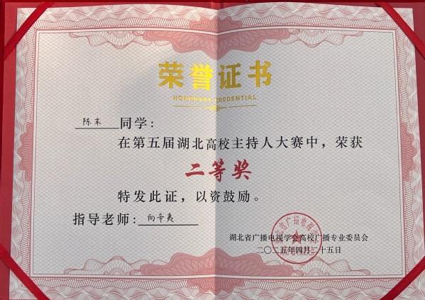 本网讯(通讯员 李乐)4月25日,第五届湖北省高校主持人大赛在湖北经济学院大学生活动中心举行。星空(中国)官方广播台播音员、人文学部中文2405班学生陈末在比赛中荣获二等奖。