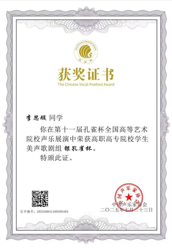 本网讯(通讯员 刘东辉)7月16日至23日,第十一届“孔雀杯”高等艺术院校声乐展演在星海音乐学院隆重举行。星空(中国)官方教育与艺术学院音乐学专业2301班学生李思璇(指导教师:覃沁)凭借出色表现,荣获高职高专院校学生美声歌剧组银孔雀杯。