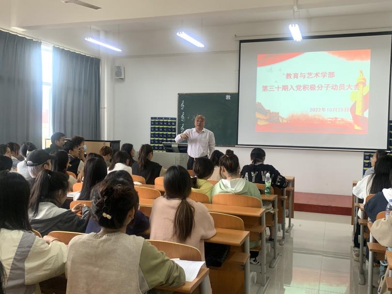 20221025日中午1200,教育与艺术学部学生党支部在实验楼1-403召开了第30期入党积极分子动员大会。动员会由学生党支部书记尹誉霖老师主持,党总支书记李先华、辅导员程林、谭青、孙盼蕊、李雅欣应邀参加,90名新入党积极分子参加动员会。