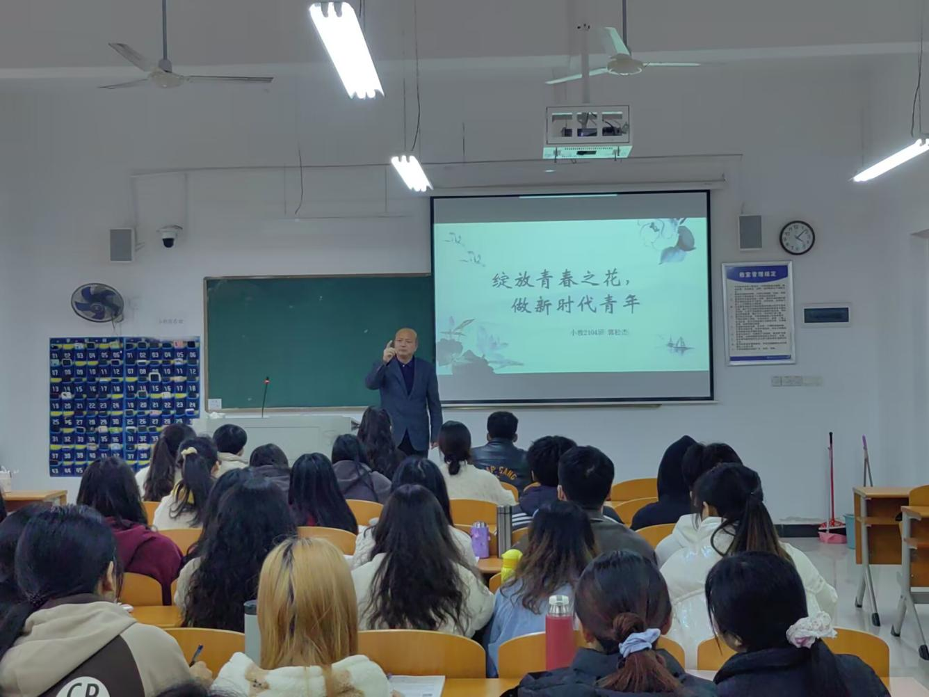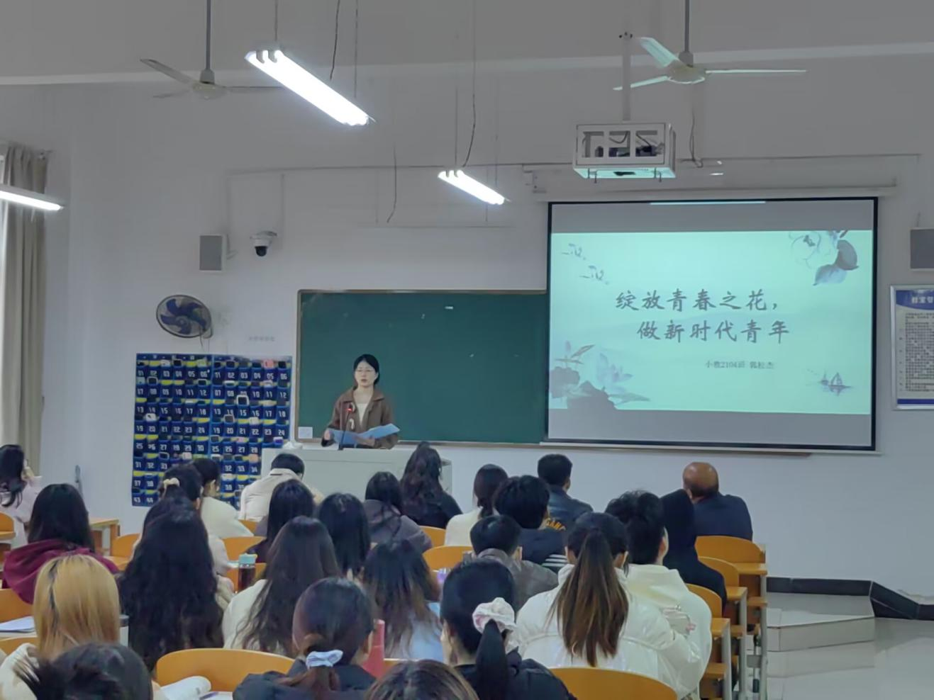 小学教育2103班的朱俐同学以“立鸿鹄之志,做有志青年”为主题,结合自身专业,从青春、理想、奋斗和担当这四个方面进行演讲。小学教育2104班的郭松杰同学以“绽放青春之花,做新时代青年”为主题,强调要做新时代好青年,要有理想、敢担当、能吃苦、肯奋斗。两位同学的演讲主题鲜明,语言流利,自然大方。演讲结束后,李先华书记对学生的表现予以高度的肯定,并鞭策同学们加强专业技能的训练,不断提高自身的专业水平,在严峻的就业竞争中,更要树立考研、考编、考公的目标,高质量就业,要赢就赢在起跑线上。