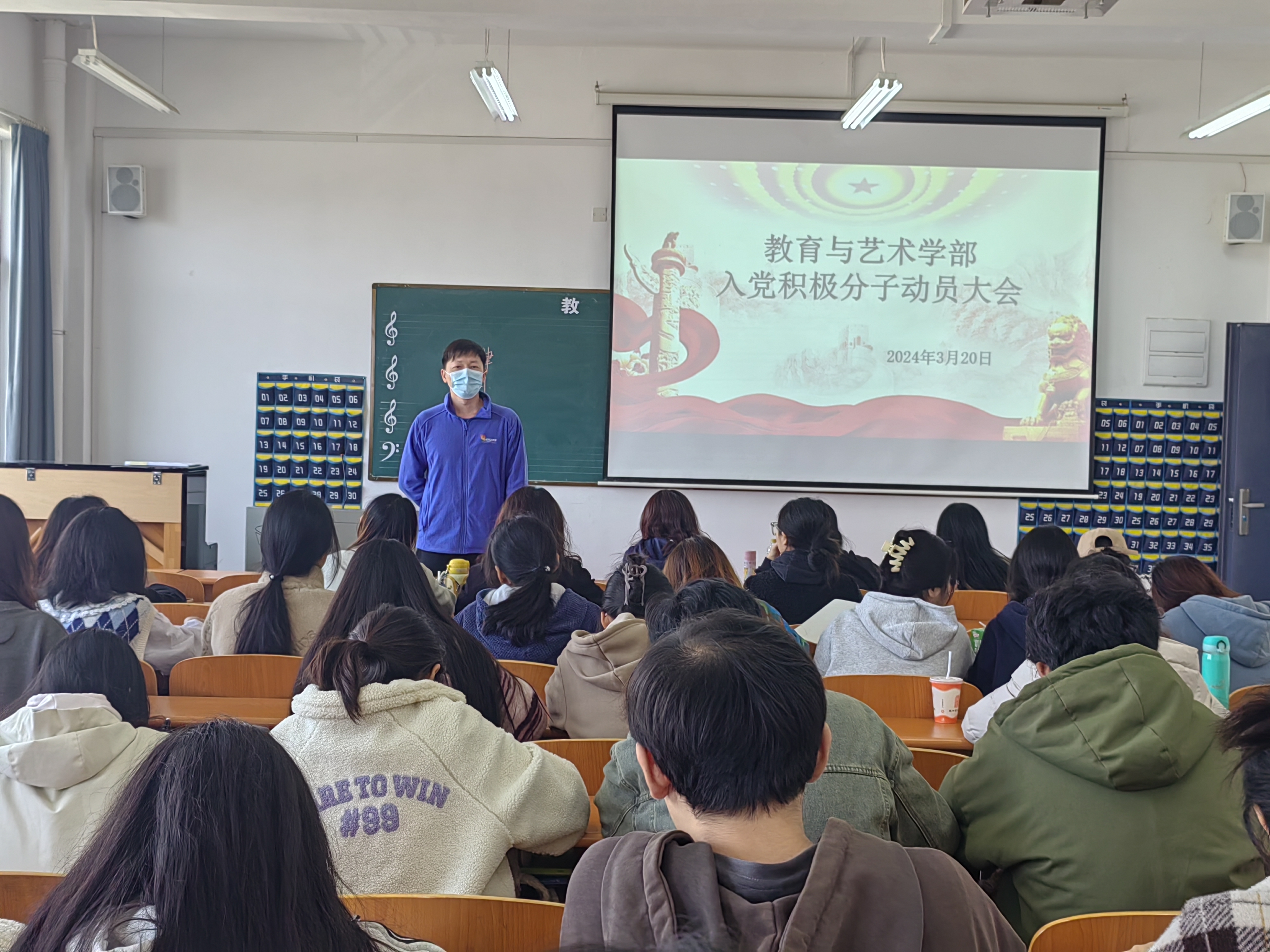 为进一步坚定入党积极分子的理想信念,增强党性修养,提升党组织的凝聚力和战斗力,教育与艺术学部于2024年3月20在1-403进行第33期入党积极分子动员大会。教艺学部党总支书记李先华、学工办副主任尹誉霖应邀参加了动员大会